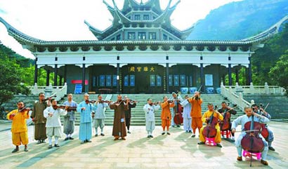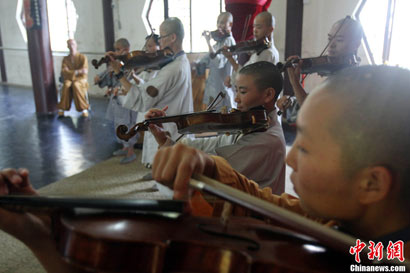 在湖北红安县海拔800多米的天台山深处的天台寺里,有一个由30多名比丘和比丘尼组成的中国首支禅乐团-广玄艺术团。信众走进寺院,未见僧人,就先闻乐音。乐器中西合璧,有小提琴也有古筝。
