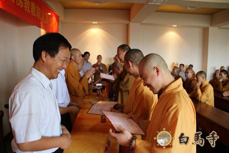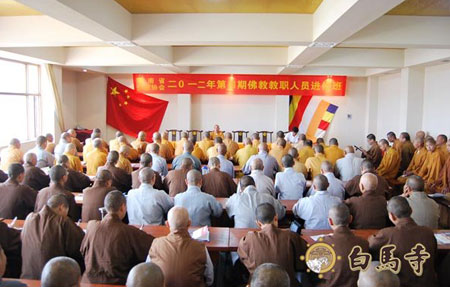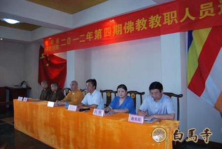 2012年9月7日至11日,河南省佛教协会第四期教职人员进修班在释源祖庭白马寺举办。此次进修学员来自全省十多个地区,近160余名参加。河南省宗教局纪检组组长赵奔利,省宗教局一处处长余德海,省宗教局政策法规处处长赵展,中国佛教协会副秘书长、省佛教协会副会长、白马寺方丈印乐法师,省佛教协会副会长、信阳灵山寺方丈学悟法师,省佛教协会秘书长赵长欣,洛阳市宗教局副局长陈建超,洛阳市宗教局科长胡轩岩等出席会议。