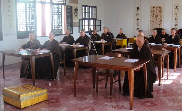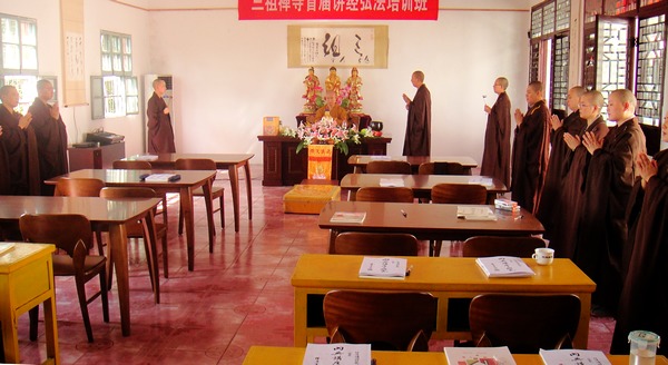2012年9月5日下午,安徽省天柱山三祖禅寺首届讲经弘法班开始上课。此次弘法班将持续半个月,由主持宽容法师主讲《内典讲座之研究》,弘法班的学员由十几位师父组成,采取私塾的形式,重点传授讲经的方法与艺术,主要分三个环节,包括讲经的方法、对佛经科判方法的判断、怎样敷小座和开大座。