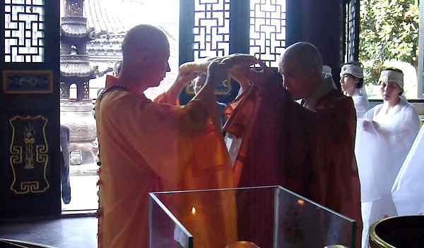 慈愿法师向宽容法师赠送金色织锦袈裟