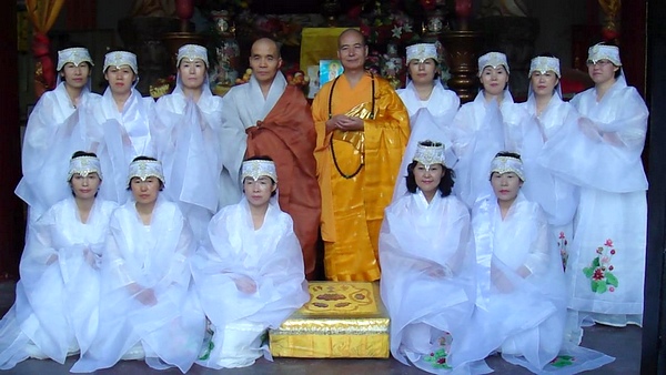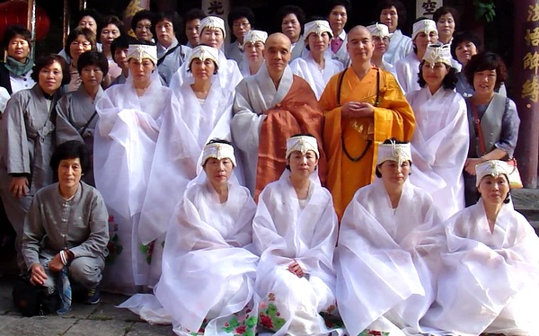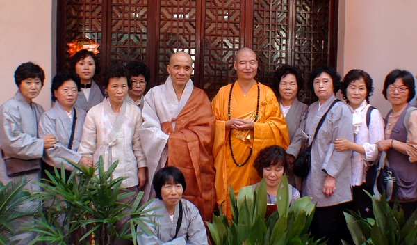 宽容法师与韩国客人在法堂前合影