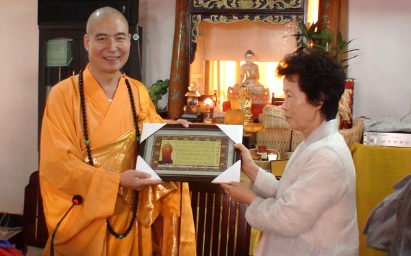 宽容法师向韩国佛母会代表赠送《信心铭》