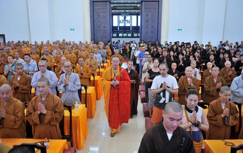 图2:净旻法师(中)在迎请引礼班迎请中步入宝陀讲寺普门讲堂