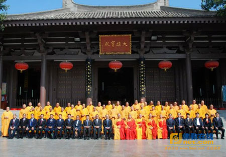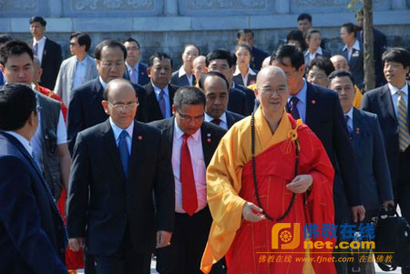 欢迎仪式后,吴登盛总统一行参观了法门寺地宫并在大雄宝殿前与法门寺僧众合影留念。离开法门寺前,吴登盛总统与学诚法师在山门前热情话别。