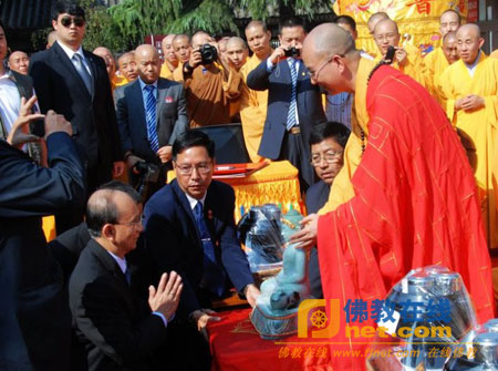 吴登盛总统首先代表缅政府向法门寺赠送玉佛一尊