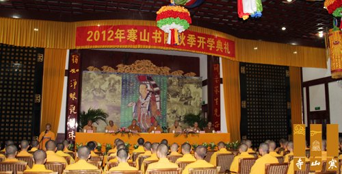 2012年9月2日上午9:30,寒山书院秋季开学典礼在重元寺法堂隆重举行,江苏省佛教协会副会长、苏州市佛教协副会长、姑苏寒山寺、重元寺方丈秋爽大和尚,苏州重元寺监院光瑞法师,寒山书院教务长本觉法师出席。本次开学典礼由宗泽法师主持。
