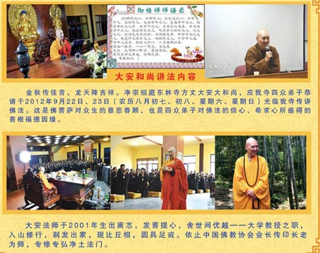 2012年9月22日至23日(农历八月初七至初八),应河南省驻马店汝南县南海禅寺邀请,净宗祖庭江西庐山东林寺方丈大安法师将到南海禅寺为四众弟子讲授佛法。(南海禅寺供稿)