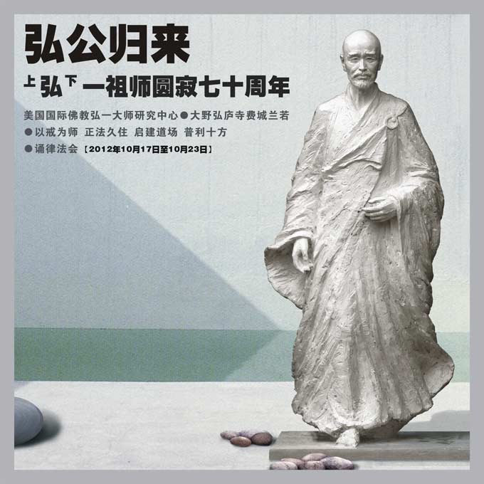 在弘一大师圆寂七十周年之际,美国国际佛教弘一大师研究中心●大野弘庐寺将于2012年10月17日至10月23日期间举行诵律法会,以此纪念被佛门弟子奉为律宗第十一代祖师的弘一大师,并藉此法会普利一切众生。