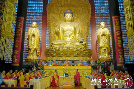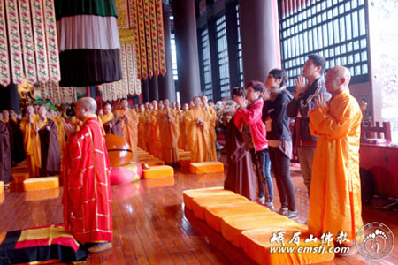11日上午,日照法师一行来到此次还愿行的第一站——峨眉山大佛禅院,中午在大雄宝殿举行上供法会,礼请峨眉山本道法师主法;傍晚设放瑜伽焰口施食法会,礼请峨眉山镇果法师、本道法师、宽祥法师主法,大佛禅院数十位常住法师及数百位信众参加了此次施食法会。12日,日照法师一行上峨眉山朝礼还愿。