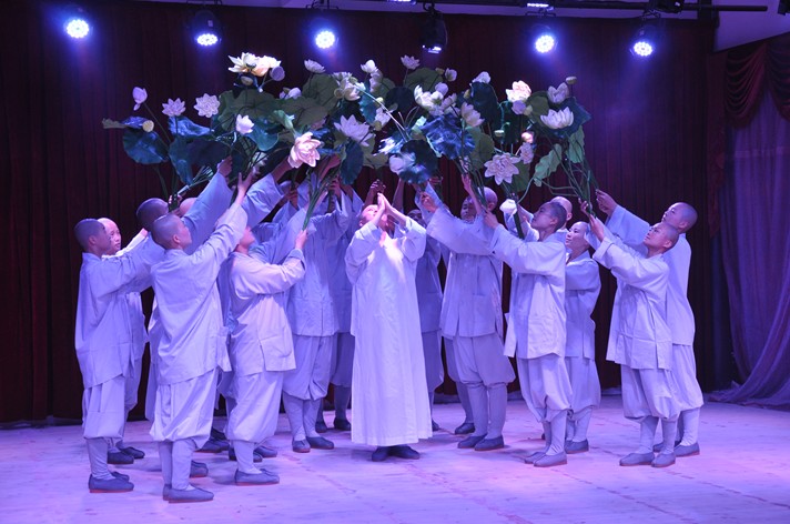 红安天台寺广玄艺术团是本次禅文化节的东道主,是佛教史上第一支全僧人禅乐艺术团,前段时间因一组图文而爆红于网络,引起了社会的广泛关注。对于为什么要创办这样一个僧人艺术团,兼任广玄艺术团团长的天台寺方丈悟乐尊师向笔者介绍,“西方基督教有唱诗班,很多没有宗教信仰的人,也愿意去教堂聆听,从而接受心灵的洗礼。我们佛教讲爱,讲奉献,佛教文化作为中国传统文化的一个重要组成部分,它是博大精深的,我想我们也应该有自己的唱经班,借鉴西方用艺术来服务社会的成功经验,用优美的艺术来表现佛法,来净化人心。观众不需要懂佛法,但他会因为看了我们的演出而感受到片刻的宁静,感受到些许心灵的慰藉,从而为他的生活带去一丝清凉,增添一份清静。我想我们的目的就达到了。”