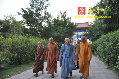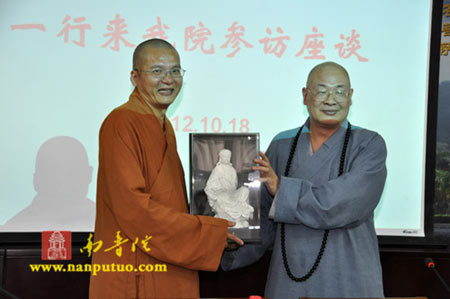 座谈会持续了二个半小时后,因时间关系,大家虽意犹未尽,但不得不告于段落。会后,双方互赠礼物,并于南普陀寺禅堂前合影留念。傍晚6时许,闽院在南普陀普照楼设素宴宴请参学团一行。