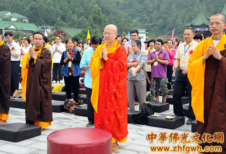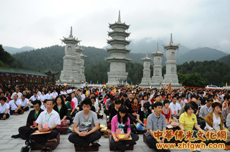 下午2点多,上千名信众云集在六祖八塔广场,顶礼膜拜六祖八塔,并禅坐共修佛法,六祖寺方丈大愿法师领众共诵《六祖坛经——无相颂》。寺院内外香火旺盛、旗幡飞扬,瞻礼诵经、青烟梵音的景象,让佛喜充满的气息在灵山中弥漫。据了解,广东四会六祖寺是六祖慧能大师隐修成佛圣地,去年10月27日,海内外108位高僧前来为“六祖八塔”开光法会主法,千余僧众礼佛持咒,绕塔洒净。