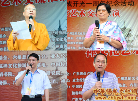 六祖寺方丈大愿法师(左上)、中华佛光文化网创始人严超议博士(左下)、尼中友好协会潘迪夫人(右上)、华南农业大学宗教与文化研究中心主任何方耀教授发表致辞