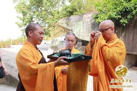 2012年10月21日,上午,新加坡佛教总会副会长,佛牙寺、护国金塔寺方丈法照法师一行莅临厦门太平岩寺参访。厦门太平岩寺住持世澄法师率两序大众于山门前恭迎法照法师到来。时值厦门太平岩寺万佛法会共修日,法照法师于大雄宝殿礼佛后,在殿前为共修居士慈悲开示,遵嘱居士勤礼佛、多诵经,清净三业,真切求三宝加持。应众之请,法照法师、世澄法师同在场居士合影留念。