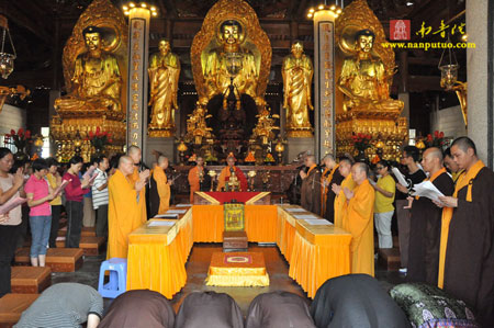 2012年9月28日、29日,正值举国喜迎十八大、中秋国庆双节来临之际,福建省厦门南普陀寺隆重举行了千人皈依、传授五戒法会。法会期间,由南普陀寺首座了法法师、西堂传明法师、副寺兼维那圆满法师、知客法仪法师等分别为求受皈依及五戒的居士详细讲解了《皈依三宝的意义》、《五戒的意义及内容》、《佛门礼仪》以及梵呗等佛教入门知识。