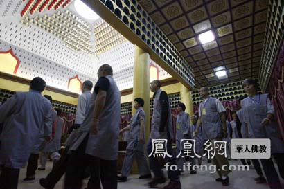 参加太仓市双凤寺短期出家体验营的营员在禅堂行香。(图片来源:凤凰网华人佛教摄影:王琬)