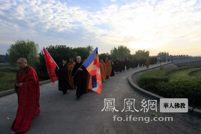 2012年10月3日早6时,双凤寺短期出家体验营营员跟随曙提法师静静的前行。(图片来源:凤凰网华人佛教摄影:王琬)