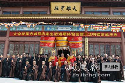 2012年9月29日晚,太仓市双凤寺短期出家体验营开营,来自全国各地的100余名营员走进双凤寺,开始为期5天的出家生活体验。由于佛教规定男众有七次出家机会,女众一生只有一次。因此,此次出家体验营不为学员剃度落发。太仓双凤寺方丈曙提法师认为这种形式的短期出家体验营在佛教方面是如法的。首先,这次活动不剃度,只体验。其目的就是让普通人体验出家人的生活,和出家人一起生活。其次,营员虽然不剃度,但他们有5天出家人的生活,对他们学佛一定有很大的帮助。第三,通过短期出家体验,可以对他们学佛上的一些知见有一些纠正。