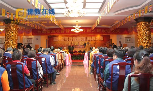 2012年10月24日上午,由台湾中国佛教会理事长圆宗长老担任导师、中华国际供佛斋僧功德会导师净耀法师任总团长、台湾新北市佛教会理事长明空法师和台湾南海观音文教基金会会长吴天池博士任副团长,率41名僧尼和279名居士到普陀山展开“南海观音寻根之旅”系列活动,当天普陀山佛教协会在普济寺大斋堂举办隆重欢迎仪式。