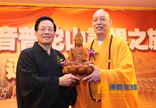 中国佛协副会长、浙江省佛协名誉会长、普陀山佛协会长、普济禅寺方丈道慈法师,普陀山咨议委员会主席道生长老,普陀山佛协副会长:惟航法师、净旻法师、信光法师、净妙法师、沈小杨居士、智宗法师、门肃法师、会闲法师等佛教界代表人士出席欢迎仪式。