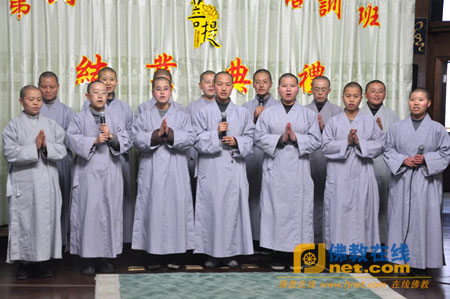 典礼上,男女学员代表率先发言。随后,学员们以朗诵、歌曲等不同的方式表达自己的感恩之心,普寿寺的小沙弥尼及比丘尼师父也以精彩的歌曲的表达了自身对法师们的敬仰及对学员们的鼓励。最后,如瑞法师作开示并清唱了一曲《大爱的人》,把结业典礼推向了高潮。高歌一曲后,如瑞法师在开示的时候还说了一句偈子作为对学员们最后的叮咛。”急急忙忙苦苦求,寒寒暖暖度春秋。朝朝暮暮营家计,昧昧昏昏白了头,是是非非何日了,烦烦恼恼几日休。明明白白一条路,万万千千不肯休。”