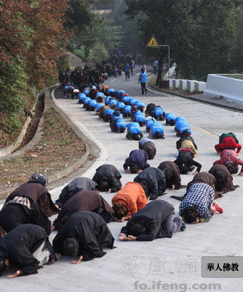 信教群众在引礼法师带领下,口念佛号,三步一拜,从山下的净化寺一直膜拜到山上弘化禅寺大雄宝殿。(图片来源:凤凰网华人佛教)