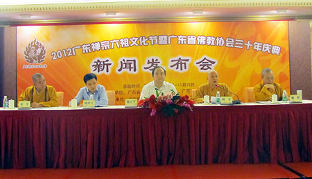 广东省佛教协会会长明生法师在会上宣布,由广东省宗教文化交流协会、广东省佛教协会共同主办的“2012广东禅宗六祖文化节暨广东省佛教协会三十年庆典”将于11月20日至22日在广州举行。主会场光孝寺活动内容包括开幕式暨广东省佛教协会30年音乐会、30年图片展、书画展、万人诵经法会、祖宗六祖文化学术研讨会、禅与诚信道德对话、广东佛学院挂牌和广东佛教界捐款383万元支持全省383个少数民族散居村建设社会主义新农村捐赠仪式等。分会场活动内容有南海观音文化原创艺术大赛、观音文化论坛、千僧祈福大典等,广州市大佛寺、六榕寺、华林寺、海幢寺、华严寺、云浮新兴国恩寺及全省有关重点寺院也将于文化节前后举行相关文化活动。