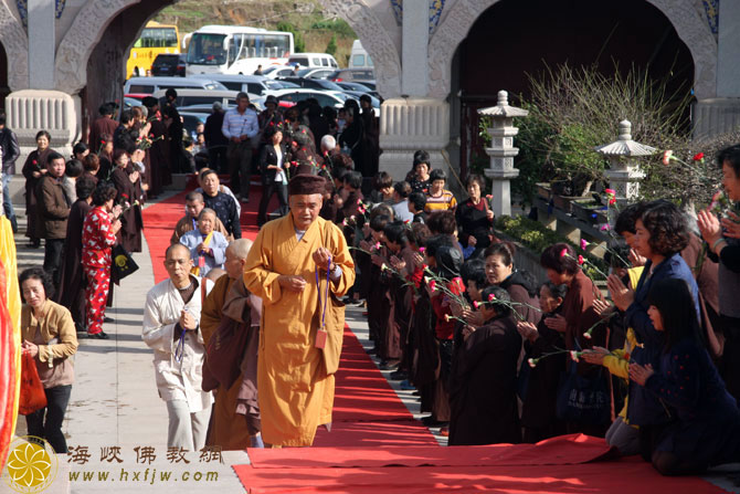 一大早,众居士便手持鲜花夹道欢迎。法师陆续到达资国寺,踏着庄严的红地毯一路走来。或洒脱飘逸的出尘之像,或悲天悯人的慈悲之像,或平易近人的温和之像,或恭谨谦卑的谦和之像。众居士恭敬合掌,虔诚顶礼。