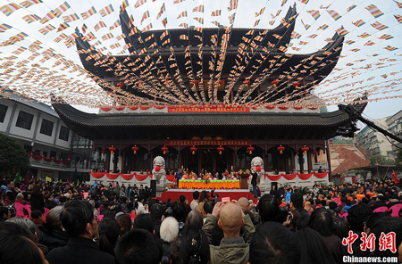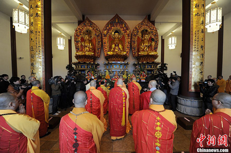 2012年11月27日,湖南省长沙市玉泉寺大雄宝殿落成典礼举行,来自韩国、新加坡,以及两岸四地的数百名僧众共同参与典礼,并为该寺全堂佛像开光。据了解,长沙玉泉寺始建于1368年,2006年开始新址重建,按照“五期六年”远景规划,拟于2015年完成全部重建工程。(图:杨华峰)