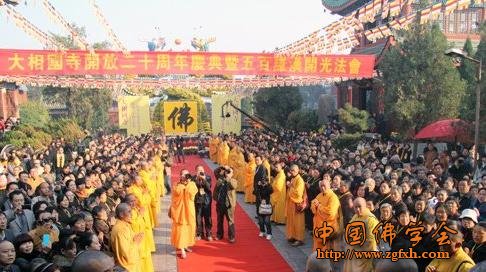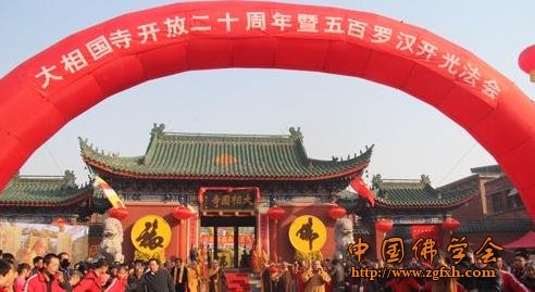 为迎接党的十八大胜利召开,感恩社会各界对大相国寺的关怀,更好的为广大信众服务,2012年11月6日,开封大相国寺内高僧云集,“开封大相国寺开放二十周年庆典暨五百罗汉开光法会”,伴随肃穆的国歌和三宝歌,在寺院天王殿前隆重举行。