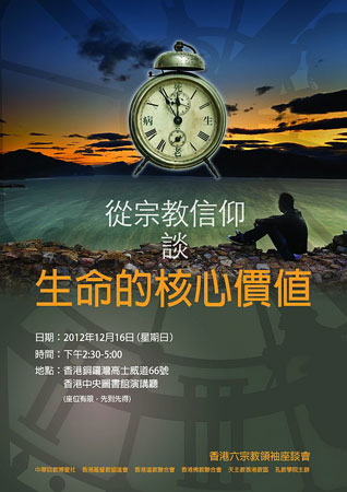 香港六宗教领袖座谈会将于2012年12月16日(星期日)下午2时30分在铜锣湾香港中央图书馆演讲厅举行。由佛教、天主教、孔教、伊斯兰教、基督教及道教各宗教的一位神职人员或学者就本年度主题“从宗教谈信仰谈生命的核心价值”进行论述及交流,并设有问答环节,现场听众可向各位讲者发问。