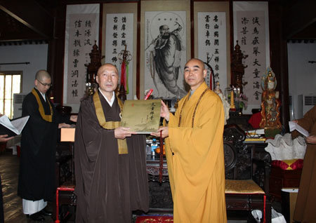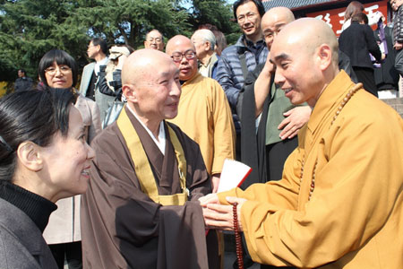团长丸子孝法感恩诚信法师的热情接待,并带来永平寺贯首的问候,之后就永平寺的道风以及僧侣修行的现实状况作了详细介绍。希望两国佛教界永久的互相参学,为世界和平做出佛教应有的贡献。并祈愿中日永久和平、世界和平。随后,双方互赠礼物并在天王殿前合影留念。