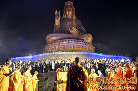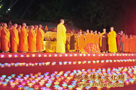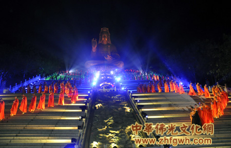 20点12分,取意“福佑2012年”,西樵山宝峰寺传灯祈愿法会准时开始,新军法师主法祈福,祈祷世界和平,祈求国泰平安。法师、居士、信众和游客虔诚拜观音。雄伟、庄严的观音像在七彩灯光的照耀下,倍增静谧与神圣。法师们整齐列队引领,大众口诵观音菩萨圣号,缓缓绕行,拾级而下,一盏盏莲花心灯,交织出五光十色殊胜的情景,手捧莲花灯,感悟菩萨的慈悲与智慧,心中则是一片虔诚和光明。明月当空,澄清而又安宁,人间佛教无边的禅意、光影辉映、虔诚的心境相衬托,殊胜的传灯仪式营造出南海佛国的胜景,可以说人生难得几回遇。新军法师开示,希望众人在这神圣的时刻,忘却种种烦恼,静心享受此刻,虔诚向大慈大悲的观世音菩萨礼拜、许愿。此次传灯祈愿法会带给大众的,不仅仅是一盏莲花灯,更多的是观音菩萨所给予心灵上的无上光明与慈悲。