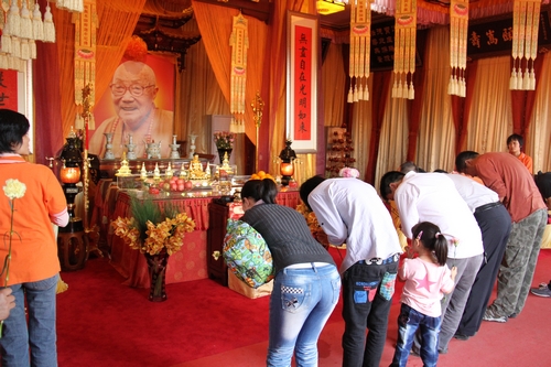 在法堂内,十方信众排起长长的队伍,礼拜本焕长老遗像和舍利。