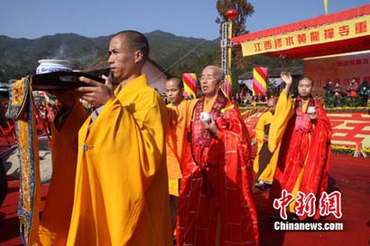 江西省内外高僧大德和黄龙寺新任主持心廉法师共同为黄龙寺重建重光奠基,并举行了黄龙祖师祭拜祈福法会。(图片来源:中新网)