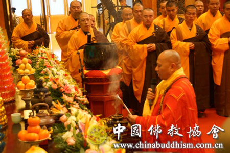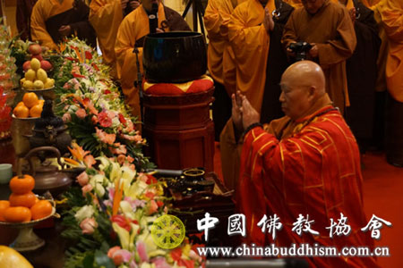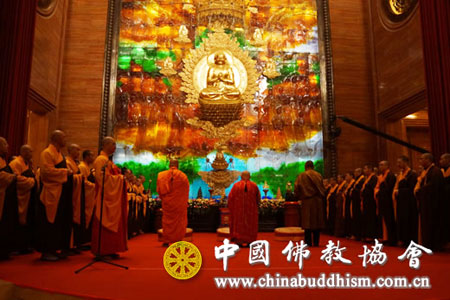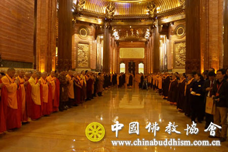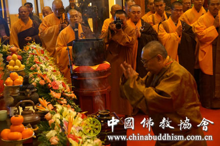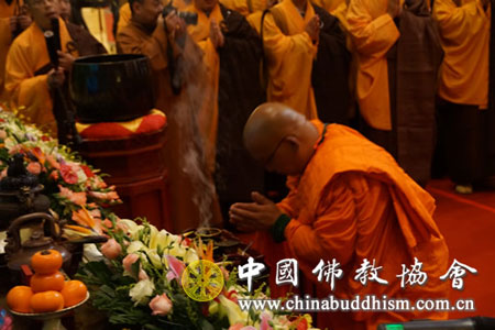 2012年11月25日,为期两天的中国佛教协会第八届理事会第二次常务理事会会议在无锡灵山梵宫开幕,开幕仪式前中佛协在梵宫廊厅举行祈祷国泰民安、世界和平法会。随着庄严的“戒定真香”香赞腔起,廊厅内顿时梵音嘹亮、海会祥和,学诚副会长主持法会,传印会长、嘉木样副会长、祜巴龙庄勐副会长分别代表三大语系主法拈香。(图:陈星桥)