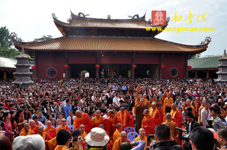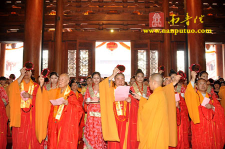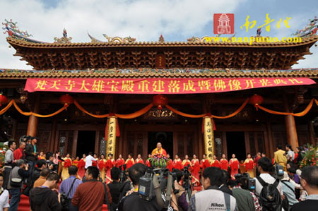 上午10时,海峡两岸诸位高僧大德为同安梵天禅寺大雄宝殿重建落成暨佛像开光庆典仪式剪彩、洒净、开光。