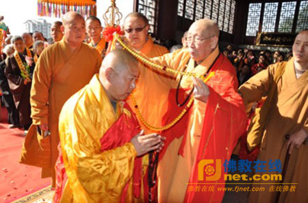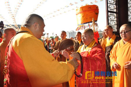 上午9点,升座仪式开始,仪仗队托戒定真香山门外迎请永常法师,永常法师执杖至山门诵升座词,随后至法堂,心澄法师、明学长老、秋爽法师、能开法师、廓尘法师、传静法师、能超法师分别为永常法师展具送位、挂佛珠、授锏板、授拂尘、授龙杖、授钵、授锡杖、授经架,松纯长老为永常法师送座。永常法师正座法王座后众弟子顶礼,永常法师燃香说法,祈福天下。
