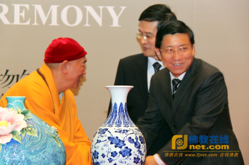 国家宗教事务局副局长蒋坚永与台北世界宗教博物馆创办人心道法师握手(两件瓷器为首都博物馆与台北世界宗教博物馆互赠的礼品)