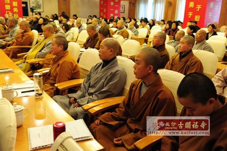 会议由长沙市佛教协会会长坚愿法师主持。长沙市委统战部副部长饶福明作了重要讲话,长沙市宗教局局长姚仁智表示了对这几年讲经说法交流会在道风建设和僧才培养方面的肯定,圣辉法师做了开示。参加讲经说法活动的7位法师都做了充分的备课,准备了互动环节和PPT课件。来参加听课的有一百多位法师,一百多位居士代表或听、或想、或笔记、或提问,课堂安静认真,互动环节生动活泼。