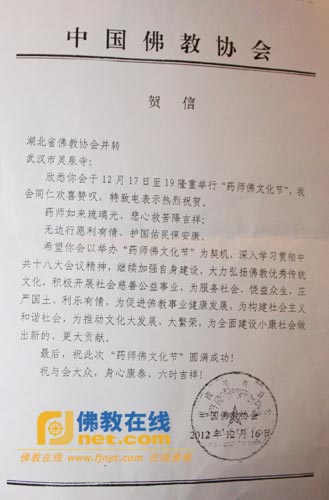 中国佛教协会在贺电中表示,希望以“药师佛文化节”为契机,深入学习贯彻中共十八大会议精神,继续加强自身建设,大力弘扬佛教优秀传统文化,积极开展社会慈善事业,为服务社会、饶益众生、庄严国土、利乐有情,为促进佛教事业健康发展,为构建社会主义和谐社会,推动文化大发展、大繁荣,为全面建设小康社会做出新的、更大的贡献。