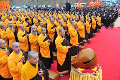 下午4点,舍利登坛完毕,供奉瞻礼大典正式开始。湖北省民宗委谭徽在主任致辞,武汉、新洲相关领导致辞,最后由中国佛教协会副会长、弘法寺方丈印顺大和尚致辞。
