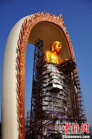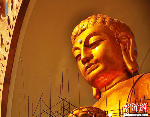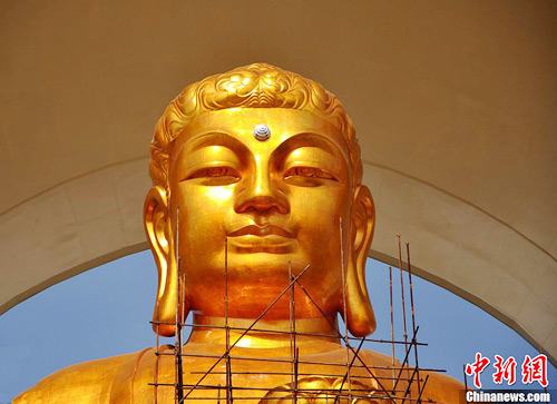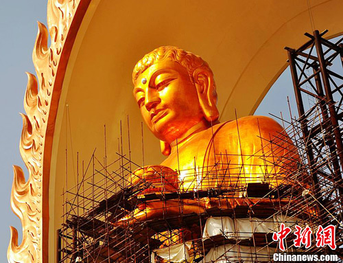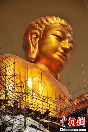 近日,江西省星子县在建的世界最高阿弥陀佛铜像——东林大佛工程接近尾声,东林大佛佛首塑金后已经露出真容。据了解,东林寺阿弥陀佛大铜像于2000年经国家宗教局批准建造,是迄今为止最高的阿弥陀佛铜像,高48米。东林大佛大铜像坐落江西庐山脚下,由佛教净土宗发源地东林寺投资兴建。
