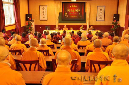 上午9时,四川尼众佛学院院长如意法师携全体师生云集多功能教室,并为参访团的到来举行热烈而隆重的欢迎仪式。