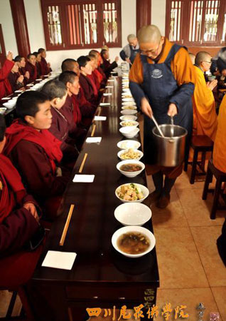 当天中午,参访团一行受邀在四川尼众佛学院的“五观堂”和全体师生共用午斋。随后,大家齐聚一堂在大雄宝殿前合影留念。