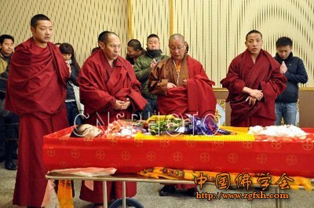 12月7日,“最美新娘”李成环追悼会在青海省西宁神安殡仪馆举行,甘肃青海两省人民在这里共同送别这位“最美新娘”。图为玉树结古寺僧人在李成环遗体火化前为她诵经超度。