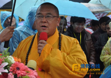 庆典仪式上午9点18分开始,江阴市佛教协会办公室副主任陈喜主持,周庄镇金湾村党委书记、村委主任周国民先生致欢迎词,周庄镇金湾村党委副书记赵忠德先生介绍了金湾寺在各级领导、各个部门关心支持下异地重建的经过,周庄镇党委副书记、镇长傅建荣、江阴市委统战部部长蔡炯分别代表周庄镇党委、政府和江阴市委向万善寺的重建落成和佛像开光表示祝贺,希望万善寺僧众在各级领导的关心下勤修三学,高举爱国爱教的伟大旗帜,积极创建“和谐寺观教堂”,为弘扬佛教文化做出积极贡献。江苏省佛教协会副秘书长文定法师向万善寺重建落成暨佛像开光表示祝贺,希望万善寺僧众刻苦学习佛教专业知识,为把中国佛教做大做强而努力。