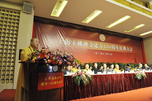 2012年12月13日,隆重盛大的上海玉佛禅寺建寺130年周庆典活动在上海玉佛禅寺内举行。上海市人大常委会主任刘云耕、上海市政协主席冯国勤、副主席周汉民,中央统战部袁莎副局长,国家宗教局王蕾处长、上海市民族和宗教事务委员会赵卫星主任、王君力副主任,上海市台办主任李文辉,市政协民宗委季文冠主任,中国佛教协会副会长珠康·土登克珠活佛、香根·巴登多吉活佛、明生大和尚、觉醒大和尚、心澄大和尚、纯一大和尚、正慈大和尚、印顺大和尚,中国佛教协会王健秘书长,中国佛教协会咨议委员会副主席明学长老、松纯长老、无相长老。上海市老领导毛经权、胡炜,上海市普陀区人大常委会主任许伟国、区政协主席钱城乡,区委常委、区统战部长郭芳,副区长王鹏和市慈善基金会和市老年基金会领导,台湾中国佛教会名誉理事长净良长老、中国佛教会理事长圆宗长老,澳门佛教总会理事长健钊长老,香港立幻法师,韩国佛教宗正协会总正释迦山长老、新加坡贤祥法师、马来西亚常恩法师。上海市佛教协会名誉会长妙灵长老,副会长慧明大和尚、照诚大和尚、定慧大和尚、光慧大和尚和周富根居士等,以及其他海内外诸山长老、大德法师、护法居士,近800人出席了庆典大会。