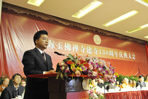 庆典大会由上海市佛教协会副会长、上海龙华寺方丈照诚大和尚主持。中国佛教协会副会长、上海市佛教协会会长、玉佛禅寺方丈觉醒大和尚首先致辞,对与会的领导和嘉宾表示热烈的欢迎,对社会各界多年来给予玉佛禅寺的关心和支持表示衷心的感谢!在简要回顾了玉佛禅寺130周年走过的风雨历程后,觉醒法师满怀深情地表示:“历数过去的成就,难抑心中的感恩。如果说玉佛禅寺在近代的发展主要是高僧云集、四众精进的结果,那么玉佛禅寺在当代的振兴,根本上得益于党和政府的宗教信仰自由政策。没有党和政府对宗教工作的关怀和重视,就不可能有佛教界的今天,同样也不可能有玉佛禅寺当前的繁荣兴旺景象。玉佛禅寺在当代的稳步发展,离不开各级领导的关怀和支持;离不开海内外诸山长老、大德高僧的热情关爱;离不开广大善信檀越的热心护持;离不开社会各界的理解和关心”。