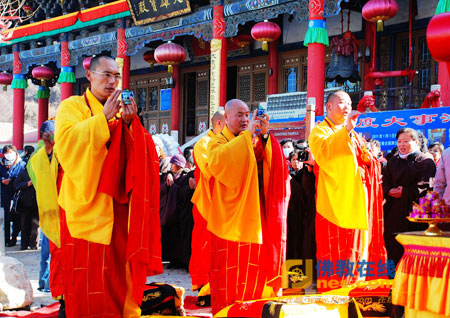 11时50分,祈福法会启动仪式在庄严的国歌声中隆重拉开帷幕。大通县人大常委会主任宋维林,大通县县委常委、统战部部长马永珍,大通县统战部副部长、民族宗教局局长汪永春,大通县旅游局局长周红,大通县人大常委会办公室主任兰生财,大通县桥头镇副镇长祁红娥,大通县老爷山景区管理处主任周春笋等各级领导与宁夏中卫宝庆寺、柒口佛光寺住持天喜法师,宁夏银川大佛寺住持道悦法师,大通县广惠寺敏珠尔仁波切,大通县祁家寺隆文仓仁波切,湟中县大光明寺住持续伟法师,互助县白塔寺住持中清法师,互助县圆通讲堂道明法师,大通县妙因寺凤明法师,大通县居士林隆莲法师等诸山长老出席了祈福法会。